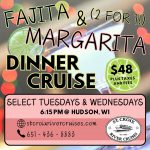 - 12pm – Depart from the Hudson City Docks in Hudson, WI for a 2 hour cruise. Enjoy a delicious Brunch of Breakfast and Lunch entrees served buffet style along with a delicious dessert table.